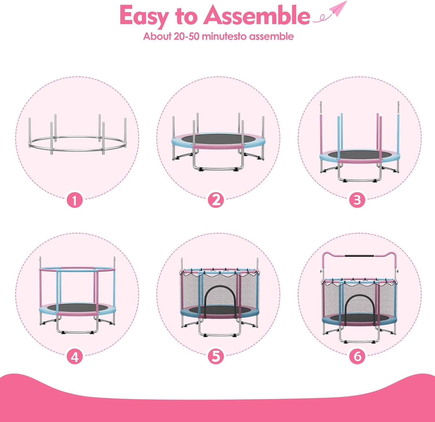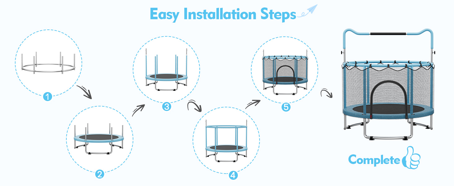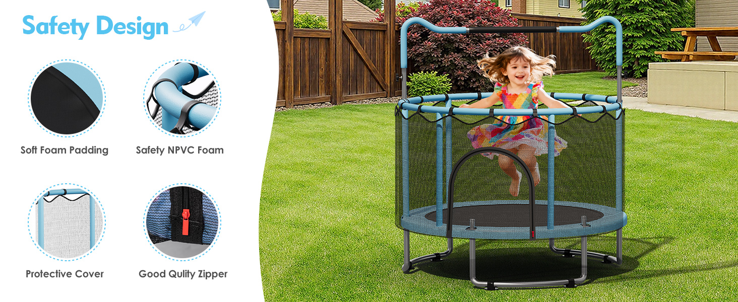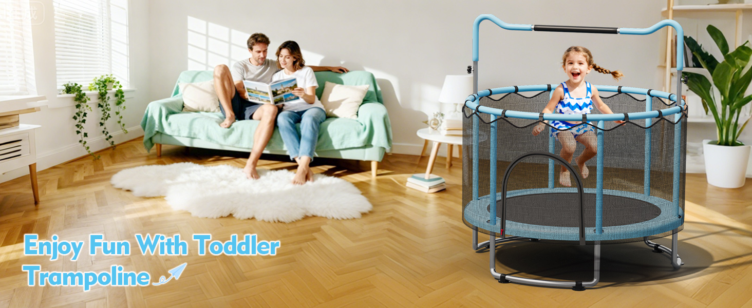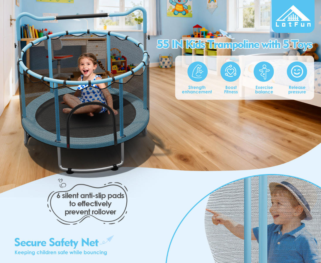 360° Protection: Our 55 inch toddler trampoline features a 360° surround thickened safety pad and a 31.5-inch PE safety net, allowing parents to easily monitor their child's activity. It provides a sturdy and secure trampoline space for kids to enjoy jumping fun