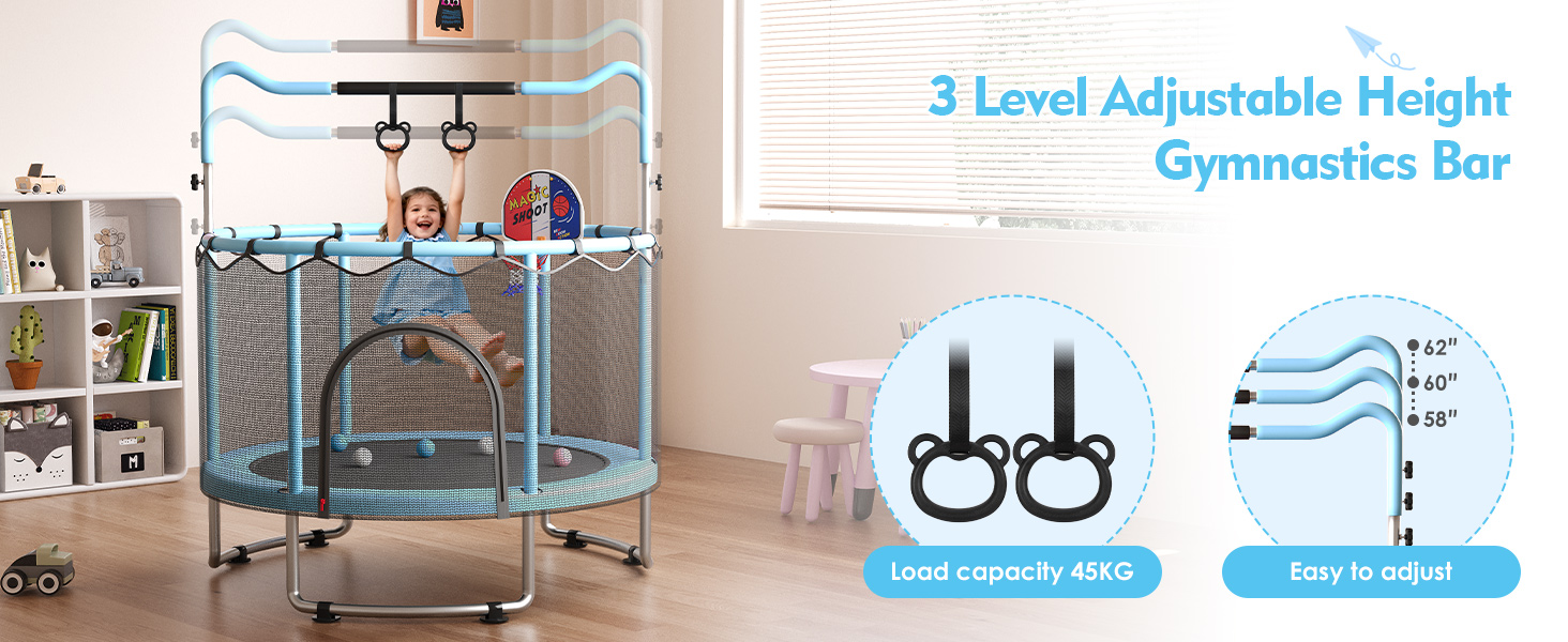 Height Adjustment: LotFun kids trampoline features a 3-level height adjustment design (58/60/62 inches), allowing flexible height customization as your child grows. It adapts to play and exercise needs across different age groups, helping children gradually improve coordination and balance while extending the product's lifespan