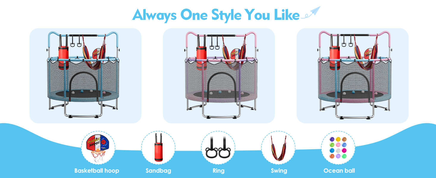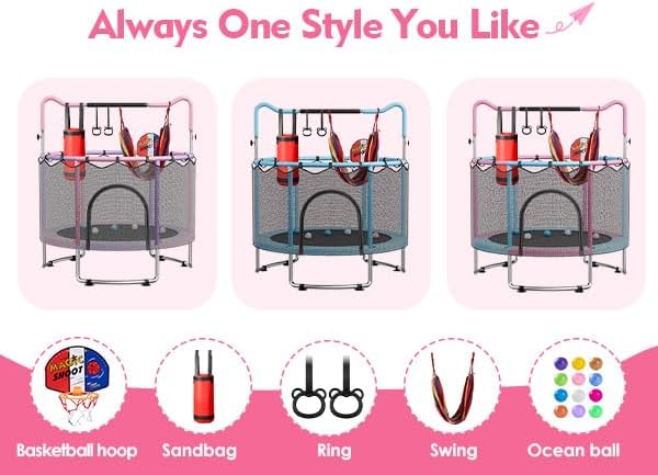 Multi-functional Accessories: Indoor toddler trampoline includes five toys—a basketball hoop, swing, rings, sandbag, and ocean balls—enriching play experiences. Beyond bouncing, children can shoot hoops, swing, play with sandbags, and more, promoting physical. Enjoy indoor/outdoor exercise fun