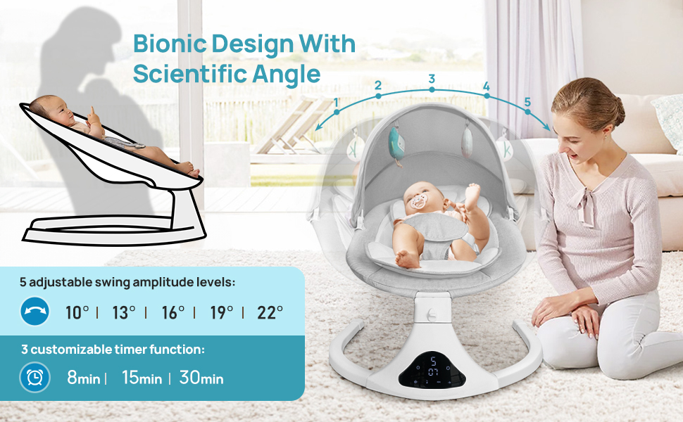 5 Amplitudes for Baby Swings for Infants: RIVIPLOU electric baby swing is finished with 5 different swing amplitudes. To better protect your newborn baby's safety, the swing level between each amplitude is designed to be a very gradual difference. You can find the perfect swinging motion for your infant.