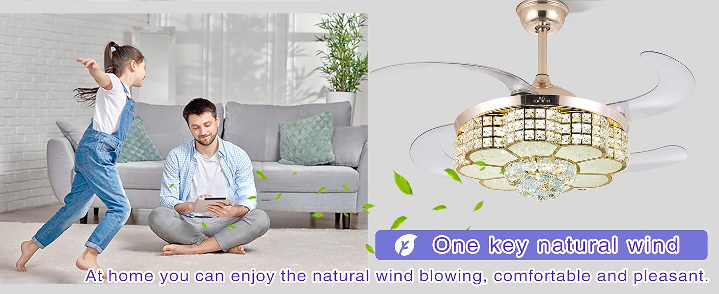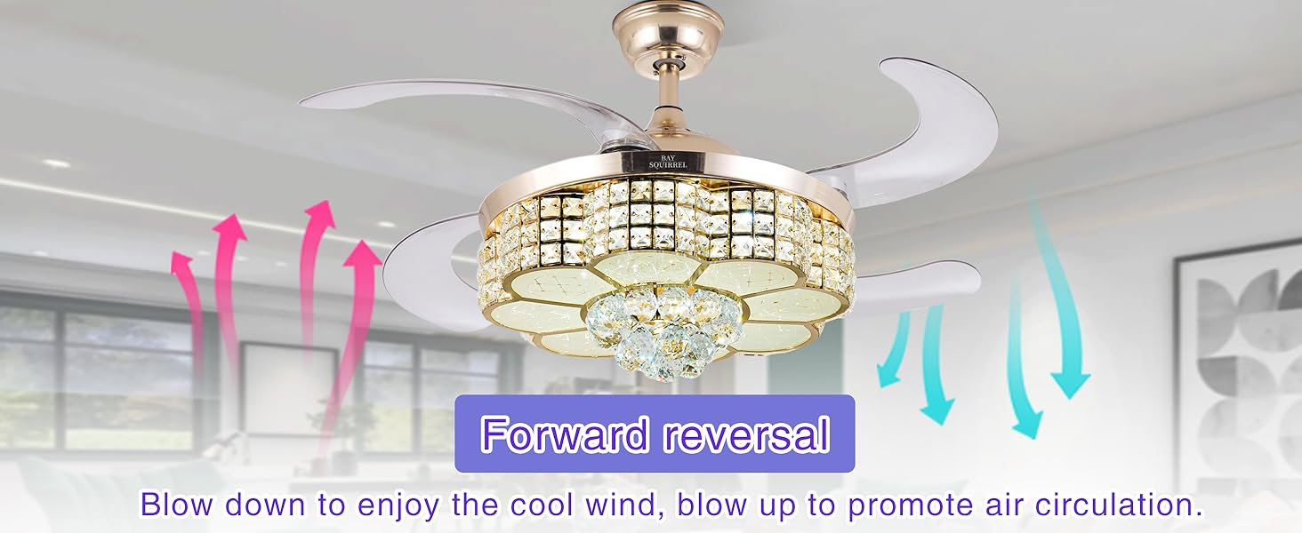 【6-Speed Reversible Retractable Ceiling Fan】: Retractable Bluetooth Ceiling Fan, thickened acrylic transparent 4-leaf retractable blades, the 6-speed fan supports forward and reverse rotation. the fan blades are rotating forward to provide you with strong cold air in hot summer, and in winter Ceiling fans reverse to provide fresh air throughout your home