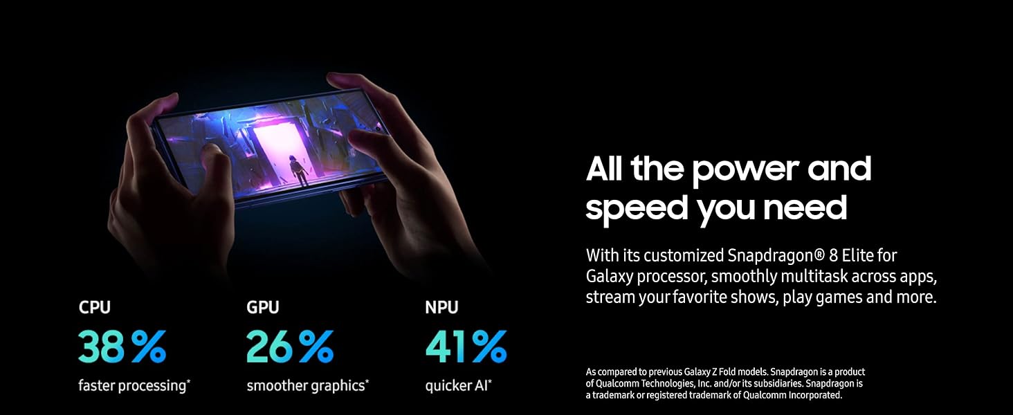 ALL THE POWER AND SPEED YOU NEED Smoothly run your day with the power and speed of Galaxy Z Fold7. With its customized Snapdragon 8 Elite processor for Galaxy, you can stream your favorite shows, edit photos, scroll social feeds and more with ease.³