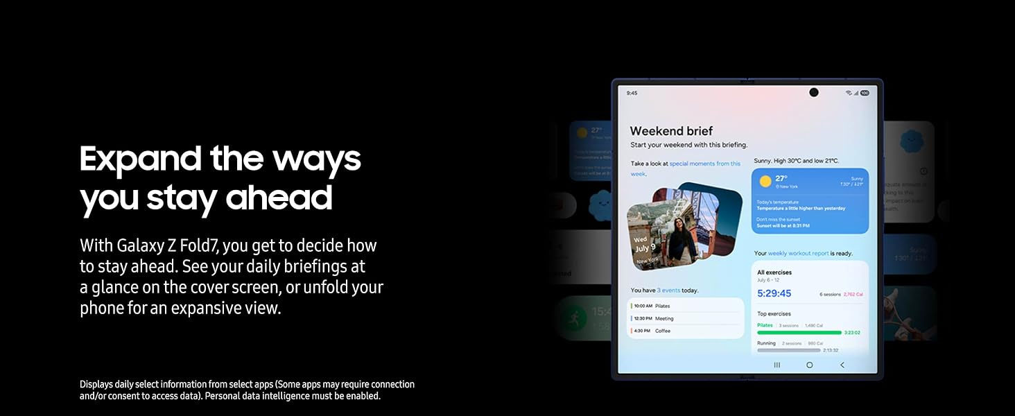 EXPAND THE WAYS YOU STAY AHEAD: With Galaxy Z Fold7, you get to decide how to stay ahead. See your daily briefings at a glance on the cover screen, or unfold your phone for an expansive view.