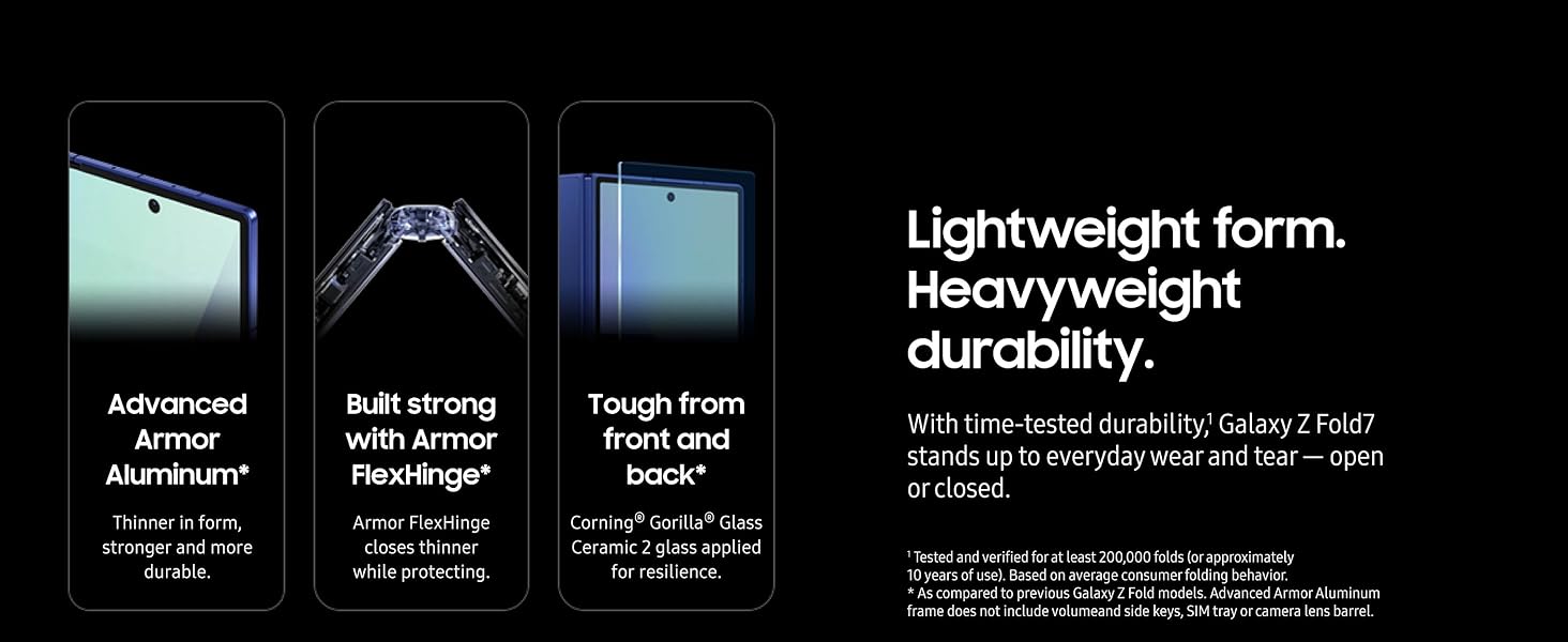 TIME-TESTED TOUGHNESS: With a new, advanced Armor Aluminum frame and a Corning Gorilla Glass Ceramic 2 display, Galaxy Z Fold7 is built to handle whatever your on-the-go lifestyle throws at it.⁴